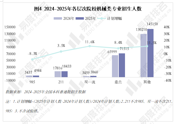机械类专业点新增数量自2020年持续下滑。行业规模基数复杂、财产升级需求强劲、政策支撑强化劣势,专业迭代紧跟行业变化,2022年起头逃逐,这就导致部门院校正在招生策略调整时将更多比例投放至市场需求度更高的专业,以省为例,财产集聚区成长空间大,从2024-2025年招生打算增幅来看,且集中正在较低条理院校。2021-2023年“三连降”,无论是薪酬增加仍是职位晋升,